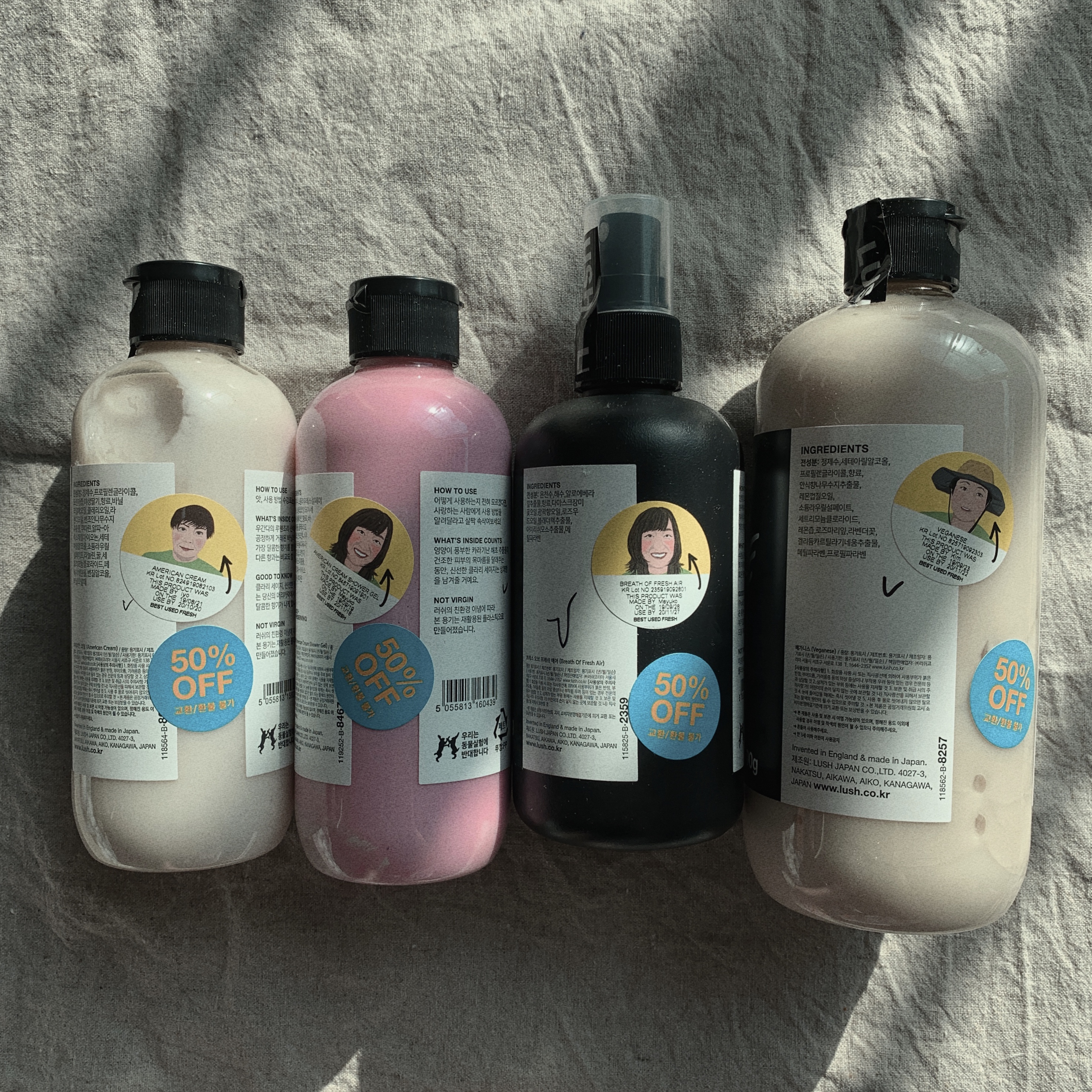 총 네 가지 제품을 구매하였습니다! 러쉬 프레쉬 세일 때 구매한 제품이기 때문에 모든 제품에 세일 스티커가 부착되어있네요! 아마 교환/환불 불가 표시인 것 같습니다! 그리고 네임펜으로 체크 표시를 해뒀는데 아마 세일 제품인 거 표시하는 것 같습니다.