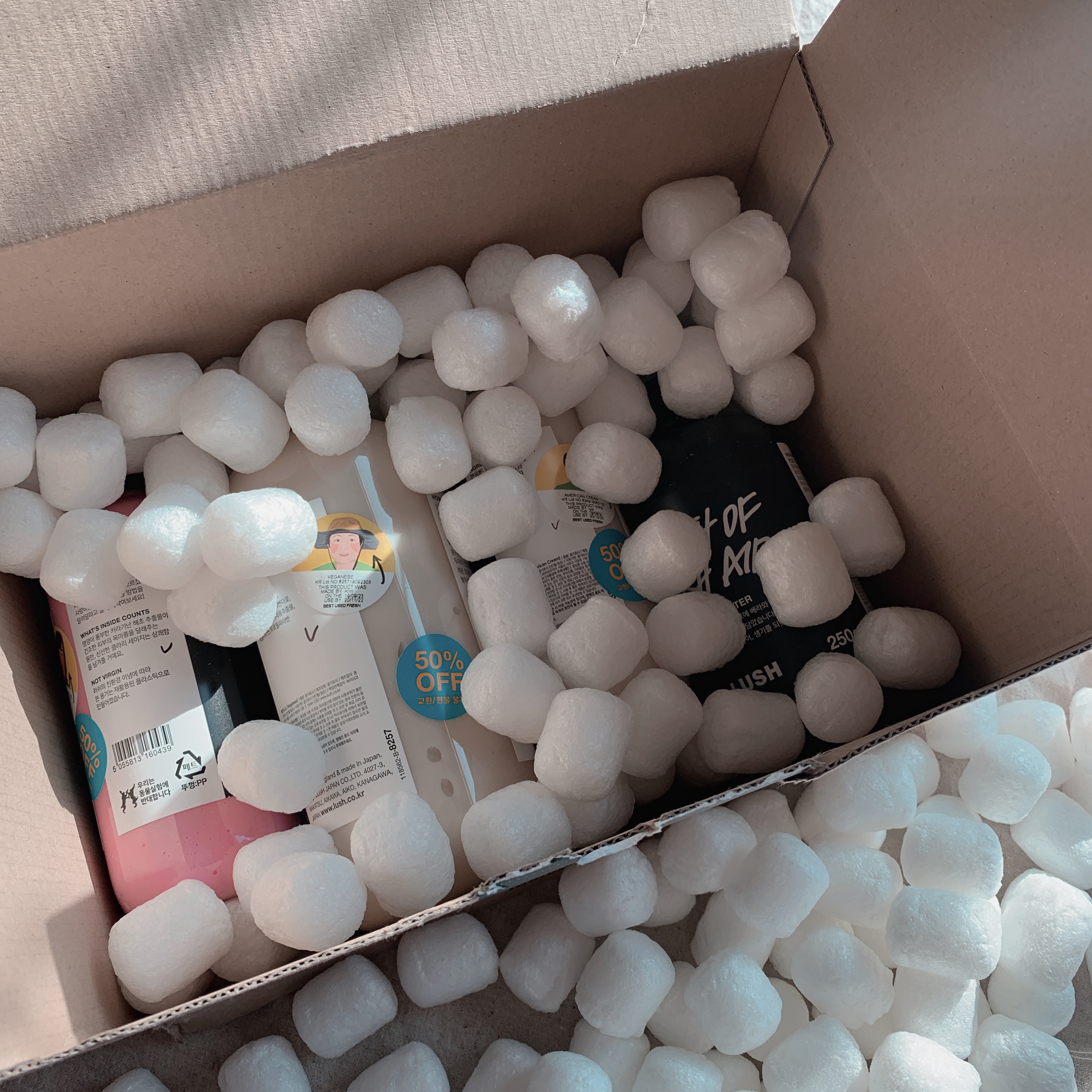 개인적으로 겨울에 택배 받을 때 그 찬 공기 때문에 기분이 너무 좋습니다! 우체국 택배로 받은 후 받자마자 개봉! 역시 환경을 신경쓰는 러쉬답게 친환경 소재로 제품이 안 깨지게 보호를 했네요! 저 완충재는 옥수수 전분으로 만들어졌기 때문에 물에 녹여서 버리시면 됩니다 😉 떨리는 마음으로 개봉하는 중 ..